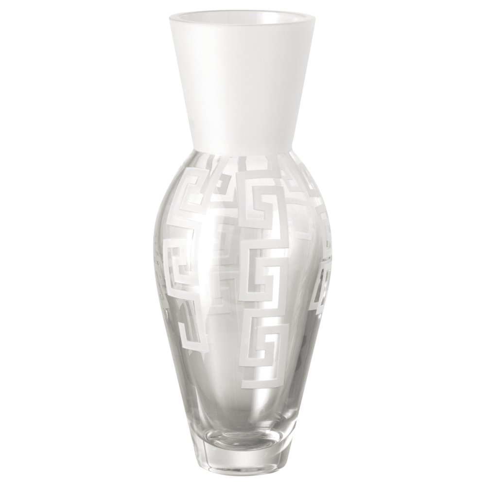 The decorative advantage of the elite Crystal Clear vase from Versace is the contrast of transparent and frosted areas. On a shaped vessel they are created with a stylized meander. Its lines run vertically across the entire surface, merge and form a wide horizontal stripe, completely covering the neck.