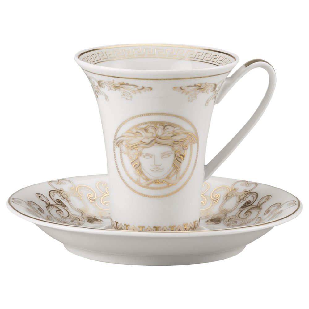The expensive Medusa Gala coffee pair is ideal for connoisseurs of exclusive luxury – noble porcelain, elegant shapes, a harmonious combination of milky white background and intricate gold painting. The cup volume is designed for a traditional serving of aromatic espresso.
