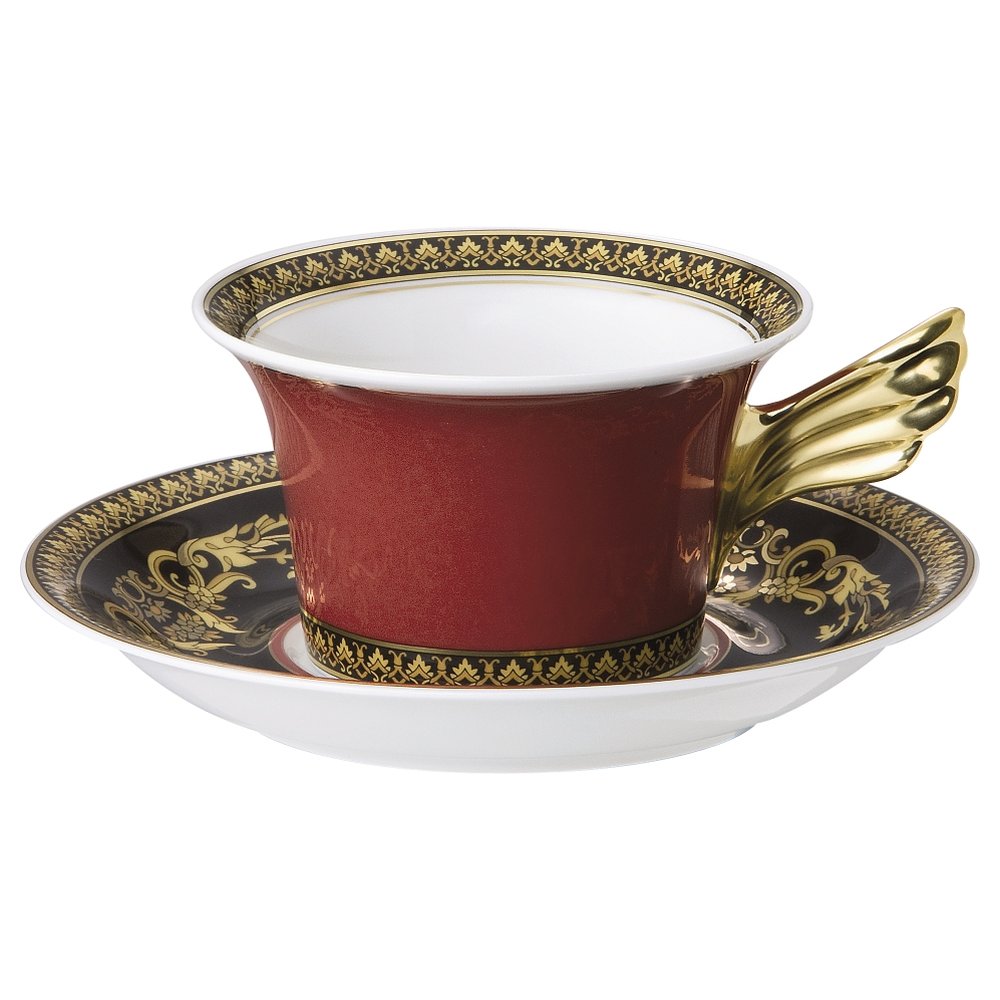 Designers of the Versace brand gave the porcelain for the expensive Medusa tea pair deep red and elegant black shades. These noble tones are perfectly combined with complex gold ornaments, which harmoniously combine the signs of classics, baroque and modernity. The fancy shape of the handle on the cup emphasizes the creative nature of the decor.