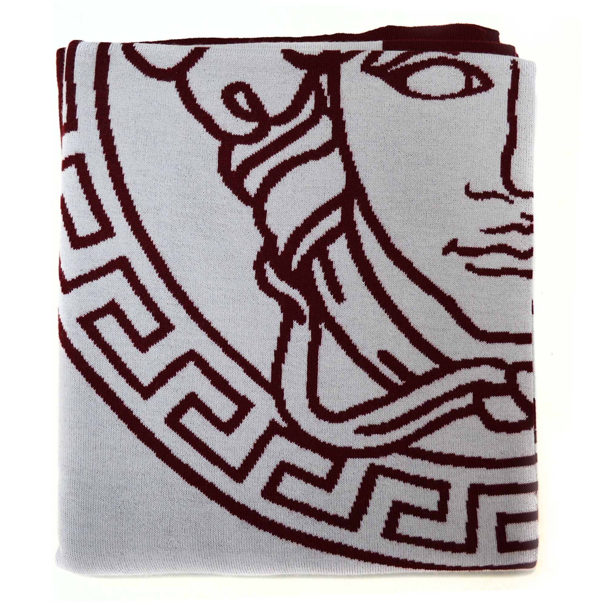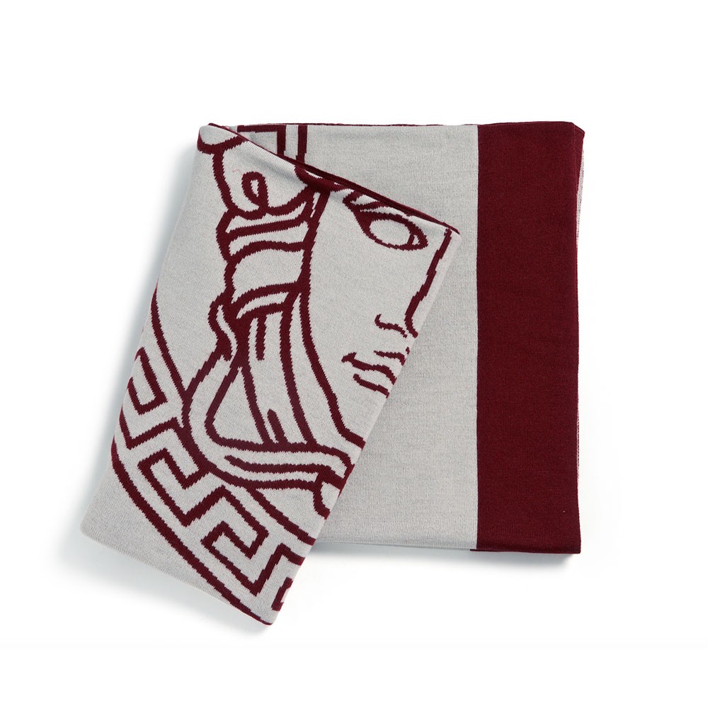 The luxury Medusa Wooly plaid brilliantly reflects the Versace principles. The product is made from premium quality wool and is knitted flawlessly; the front and back sides do not contain any defects. Luxurious and colorful: on a noble white background, the signature symbolic pattern in a burgundy shade looks impressive and elegant.