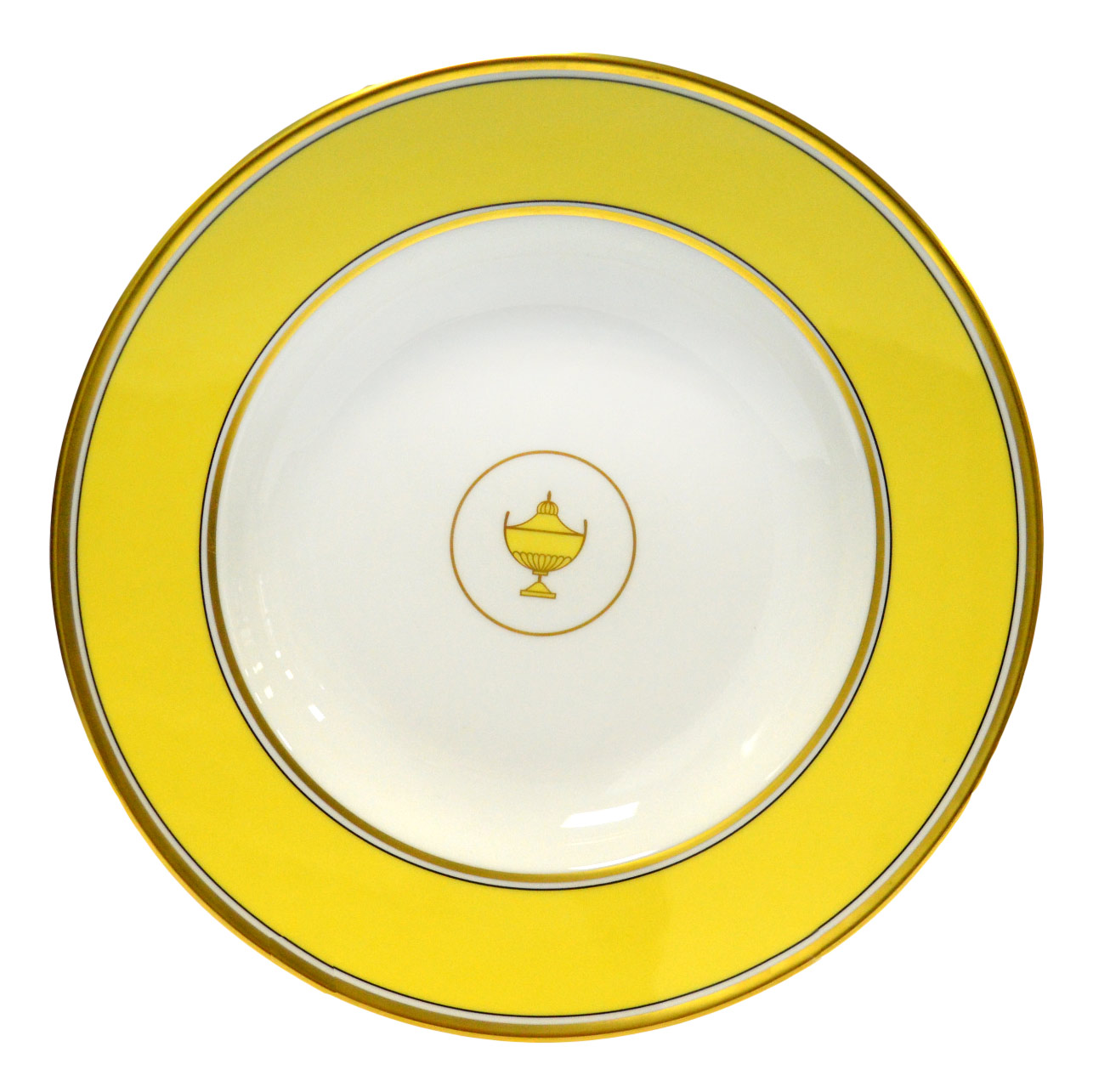 Свежий лимонный оттенок желтого тона в сочетании с золотом, широкая кайма и узор в виде античной вазы по центру — яркие эстетические достоинства брендовой тарелки CONTESSA CITRINO. Фарфоровая коллекция от Richard Ginori идеальна для роскошной сервировки.