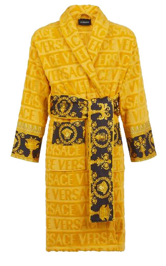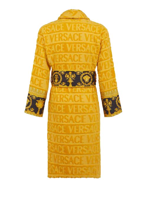 Стильный контраст желтого и черного цветов, ворсистых и гладких участков ткани, лаконичности силуэта и причудливости декоративного орнамента делает дорогой халат Versace из коллекции Barocco & Robe не просто элитной и оригинальной, но и исключительно эффектной вещью. Модель комфортна для женщин и мужчин.