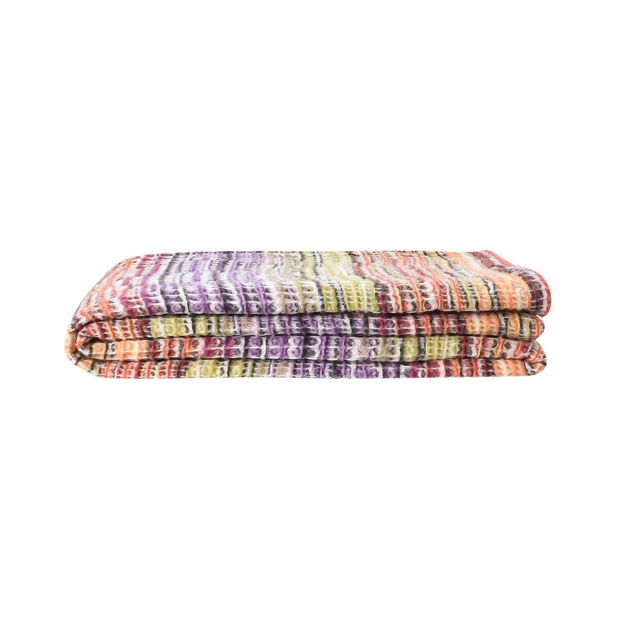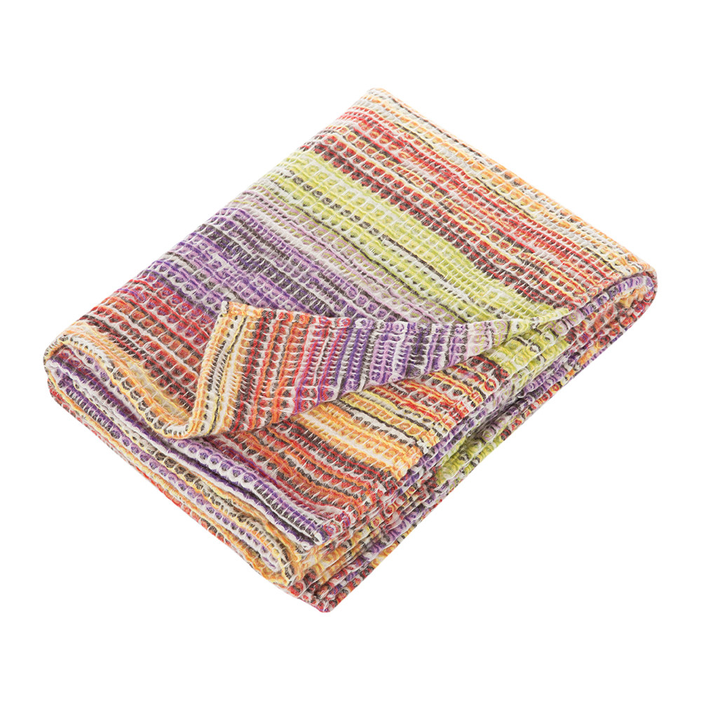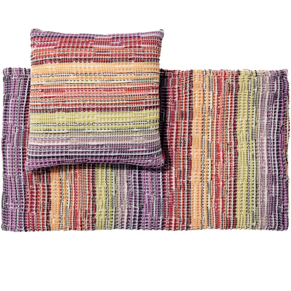 В эксклюзивном пледе Tancredi дизайнеры бренда Missoni деликатно сымитировали ручное вязание, которое придает полотну неповторимо уютный шарм. Добавление небольшого количества полиамида сделало шерстяной текстиль более прочным, хорошо сохраняющим форму.