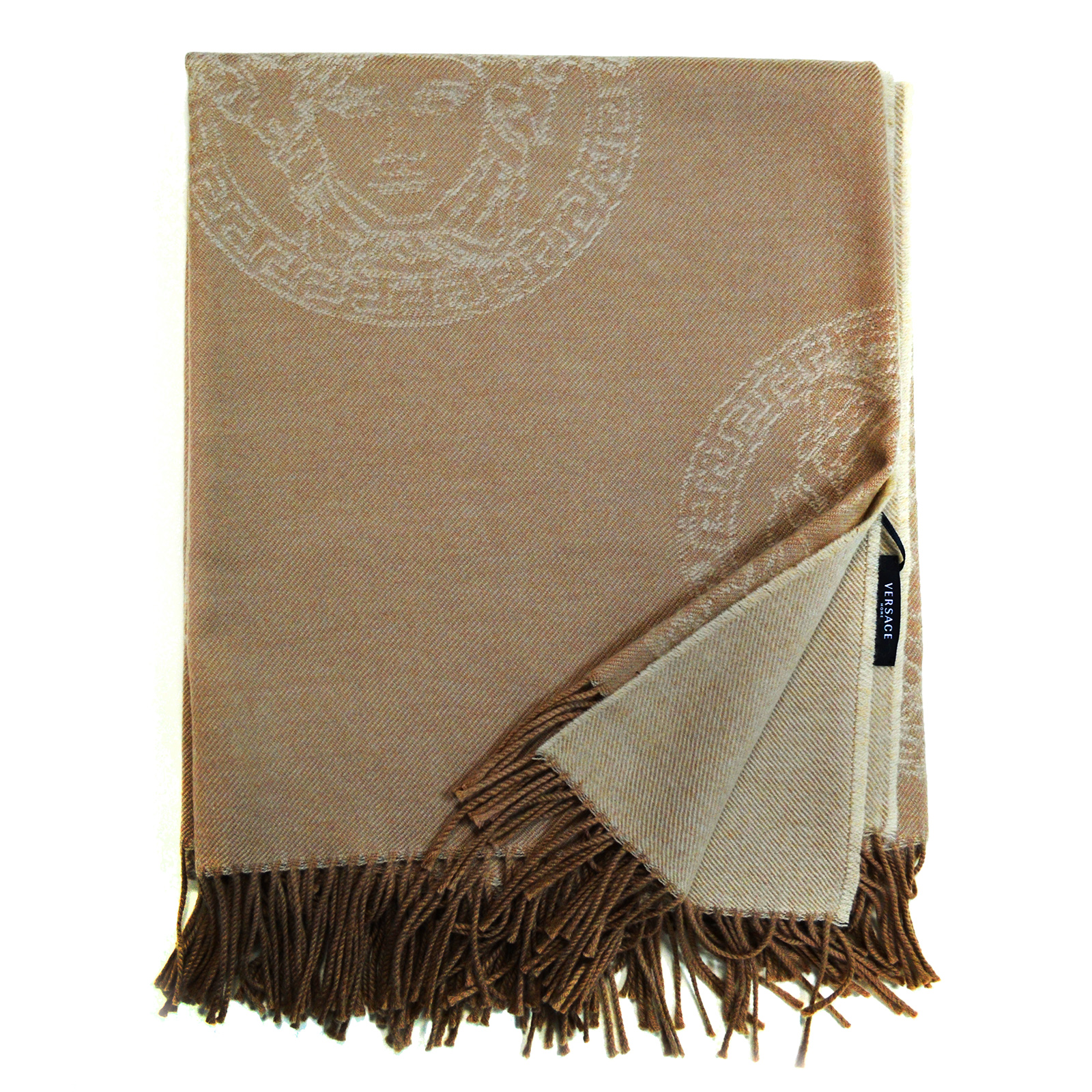 Брендовый плед из коллекции Medusa Royale понравится ценителям неброской роскоши. В нем все по-королевски дорого и элегантно: мягчайшая шерсть премиум-качества, гармония благородных оттенков бежевого цвета, безупречно связанное полотно с изображением фирменного символа Versace.