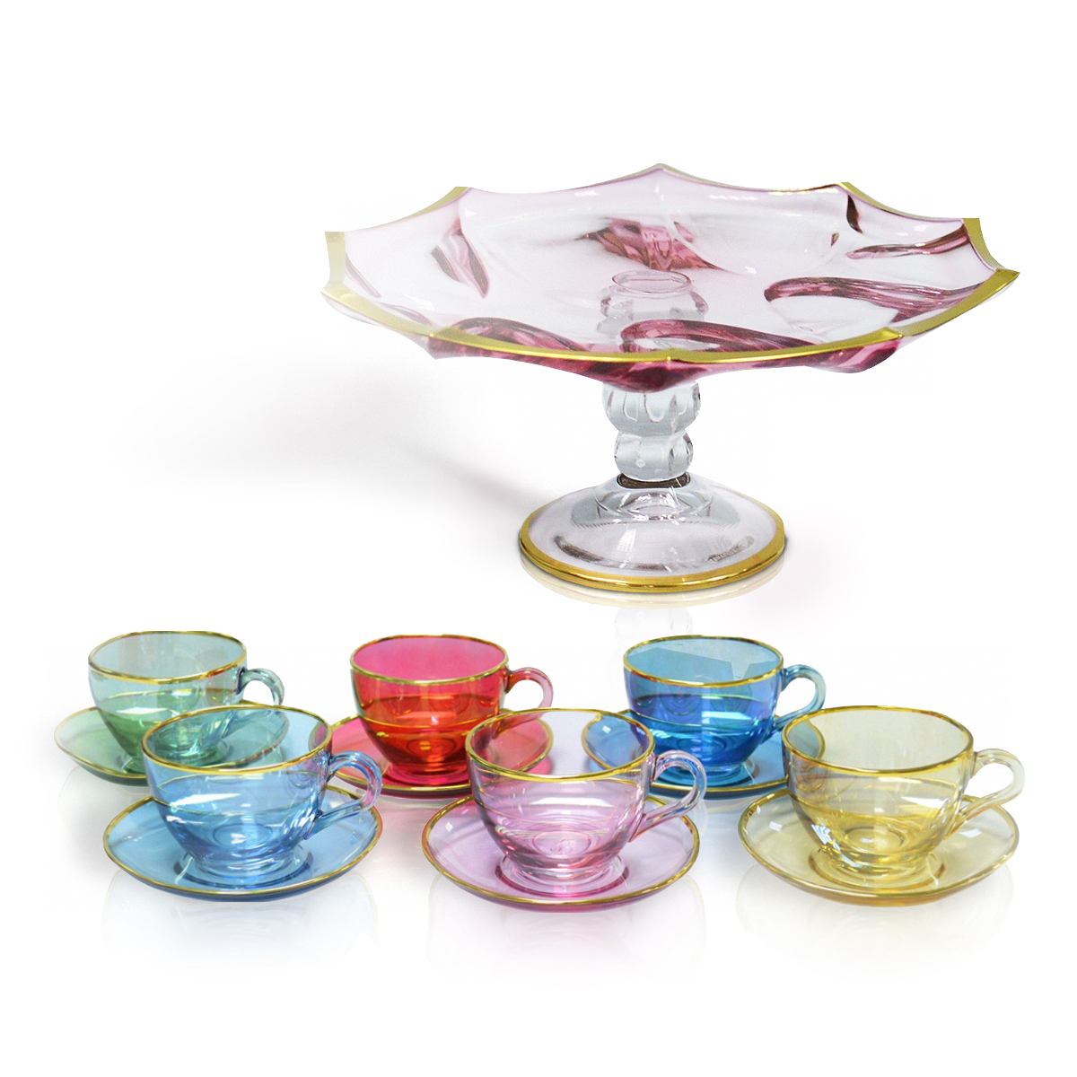 კომპლექტში შედის: ჩაის ფინჯნები/თეფშები 6ც. და ტკბილეულის თასი